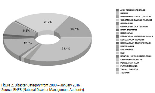 Moreover, despite its potential (rich with natural resources, demography bonus, tourism destinations, etc.), it seems that many kinds of disasters threaten the country. Figure 2 shows the statistics of frequency of disasters from 2000 until January, 2016. It indicates that floods are the most frequent disaster (31.4%), followed by tornados (20.7%), landslides (16.7%), wildfire (12.6%), and draughts (8.9%), with the rest including terrorism, earthquakes, tsunamis, climate change, volcano eruptions, famine, disease outbreaks, etc. All of these disasters undoubtedly cause a vast amount of economic losses, affecting the continuity of businesses and ultimately people's welfare.