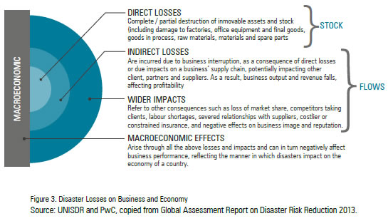 Losses caused by disasters undoubtedly affect business life and the economy. In the UNISDR's Global Assessment Report on Disaster Risk Reduction 2013, disaster losses take many forms; direct losses, indirect losses, wider impacts, and macroeconomic effects.