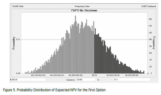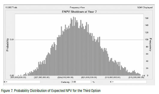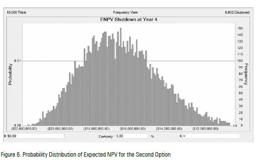 Figure 5 shows the result of the first option analysis (to continue the operation until the end of the project's life), and tells us that continuing the operation will give a chance to gain positive NPV (the probability of achieving positive NPV is 30%) with the maximum losses of about USD 9 million. Comparing the first option with the others, we can observe that the first option is the best in terms of probability of achieving NPV>0, and also maximum possible losses. The recommendation based on the results is that the management of GasFactory should continue its operation, and when new updated information is available in the future, the distribution of probability of demand should be updated to reflect the latest development of the recovery.