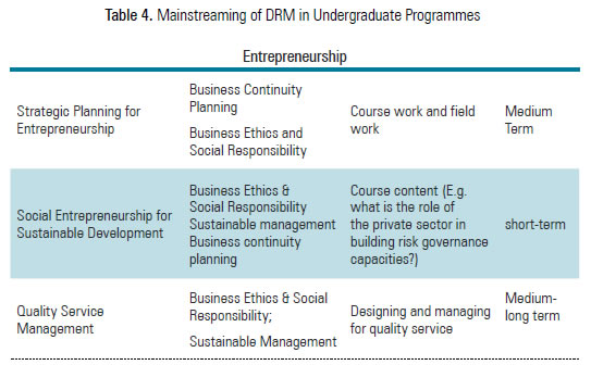 Such an approach is relevant for a number of reasons. Firstly, mainstreaming implies the inclusion of new material into existing programs not the introduction of new programmes. Secondly, it implies the inclusion is not done in a siloed fashion, particularly given the overarching and pervasiveness of DRM and its relevance to multiple areas of business performance and planning. Instead, what is argued for is a weaving of DRM into a number of existing courses and training programmes, specifically in the short term, with more focused topics being introduced over time. Thirdly, while templates are important, the suggestion here is that once there is an understanding that DRM as a general concept is to be worked into a programme, there should be some flexibility in program design and delivery which will allow for different DRM themes to be brought into specific courses as determined by the lecturer. Mainstreaming then, highlights the inter-linkages between DRM and other areas as opposed to being a distinct area of focus. Additionally, as the time frame for introducing new courses and programmes may be lengthy, the mainstreaming approach offers the ability to integrate DRM while the more costly investment in developing or formulating new courses or programmes, is considered over the long term. The approach to mainstreaming also suggests attention beyond in-class learning to all aspects of management education and training as well as other activities of the school. Finally, mainstreaming also provides for consideration the relevance of context. For example, the resources available for integrating DRM may be limited in a SIDS setting, and the types of disasters and the ways in which they impact a society may differ across regions.