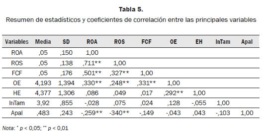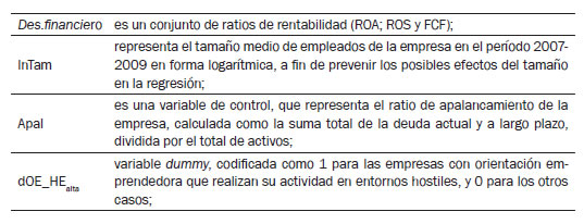 Des.financiero es un grupo de ratios financieros (ROA, ROS y FCF), lnTam es una variable de control que representa el tamaño de la empresa, Apal es una variable de control que representa el grado de apalancamiento de la empresa, y OE es el constructo utilizado como variable independiente, que asume valores entre 1 y 7.