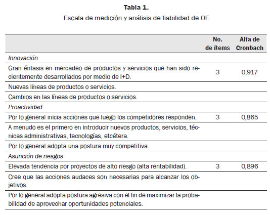 Cada dimensión se midió mediante tres grupos de preguntas. La primera dimensión trata de identificar la tendencia de la empresa hacia la innovación, mientras que la segunda y la tercera miden, respectivamente, la proactividad y la propensión a la asunción de riesgos. Cuanto más alto sea el puntaje (mínimo 1 y máximo 7), más emprendedora es la orientación estratégica de la empresa. La escala obtuvo un promedio de 4,19, con una desviación estándar de 1,39. La fiabilidad de las dimensiones fue medida con el Alfa de Cronbach. En todas las ocasiones el coeficiente de fiabilidad fue superior al 85% (v. Tabla 1).