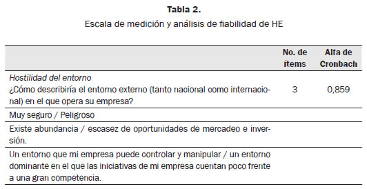 El constructo de HE se midió utilizando la escala desarrollada por Khandwalla (1977), la cual ha sido empleada en diversas investigaciones (ej. Covin, & Slevin, 1989; Dimitratos, Lioukas & Carter, 2004; Robertson & Chetty, 2000). La HE se mide a partir de tres ítems con una escala Likert de 7 puntos. Las puntuaciones más altas reflejan un entorno más hostil. La escala obtuvo un promedio de 4,37 y una desviación estándar de 1,30. La fiabilidad de las dimensiones fue comprobada con un Alfa de Cronbach de 0,859 (v. Tabla 2).