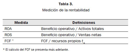 El ROA es usado como una medida de rentabilidad de los ingresos contables; el ROS se utiliza como una medida alternativa de la rentabilidad (margen de beneficio); y el ratio de FCF mide el flujo de efectivo real. De acuerdo con Griffin, Lont y Sun (2010), la proporción entre el FCF y los recursos propios al final del año anterior (valor en libros), se emplea para controlar el efecto del tamaño de la empresa. La Tabla 3 resume las medidas.