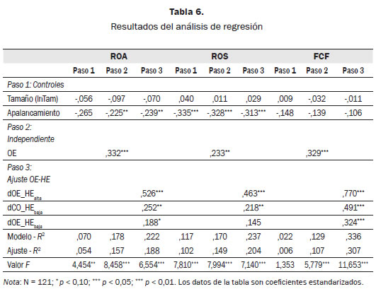 Las hipótesis de investigación fueron probadas mediante modelos de regresión múltiple. El análisis se estructura en tres pasos. El primer paso es el modelo base, que contiene solo las variables de control en consideración (tamaño y apalancamiento). La influencia del tamaño de la empresa no resulta importante en cualquiera de los modelos. Sin embargo, el apalancamiento sí resulta significativo para predecir la rentabilidad sobre los activos (ROA) y el margen del beneficio (ROS), pero no lo es para predecir el FCF.