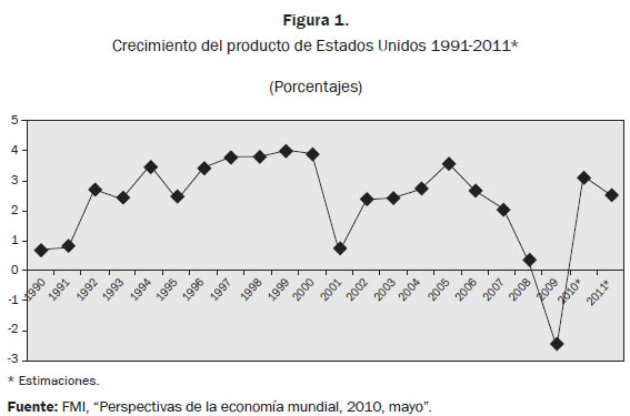 El comportamiento de la economía de Estados Unidos revela un contexto recesivo6 en 1994-1995, en el 2001 y, la más reciente y grave, en el período 2008-09, con una leve recuperación en el 2010, pues volvió a caer en el 20117.