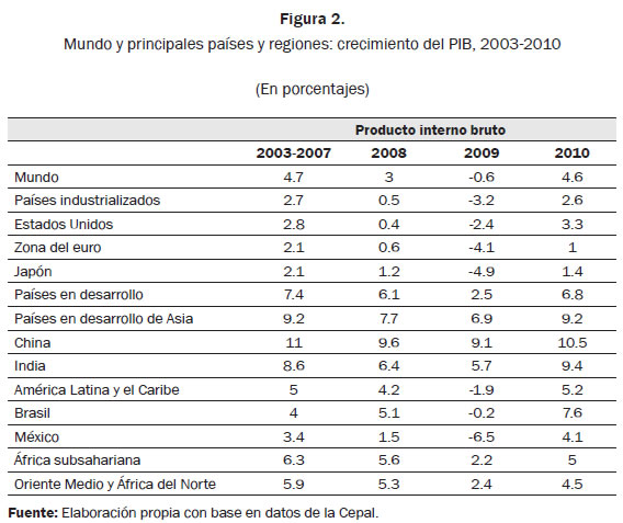 El comercio mundial, que viene creciendo en los últimos años (2003-2008) a una tasa del 8%, se reparte con porcentajes novedosos en los países en desarrollo de Asia (16,2%), China (20,4%) e India (24,6%), mientras que América Latina y el Caribe (7,5%), están por debajo de la media mundial; sólo Brasil está por arriba de la media, con (9%), y México por debajo, con (6,1%).
