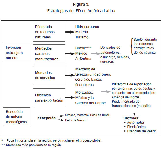 Al construir un esquema que nos permita contemplar la reciente estrategia de la IED en América Latina notamos que ya no son solo los recursos naturales o el bajo costo de la mano obra los principales atractivos de las inversiones foráneas en la región (v. Figura 3).