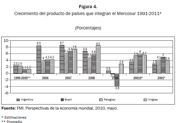 A finales de la primera década del siglo XXI el Mercosur constituyó un bloque importante del comercio mundial. Y es de señalar la importancia bilateral de Argentina-Brasil, pues estos dos países suman el 95% del PIB subregional, lo cual los constituye en el motor fundamental de la integración del Mercosur; en cuanto a la IED en el Mercosur, Argentina y Brasil países acaparan más del 90%, y lo mismo ocurre con el intercambio comercial (v. Figura 4).