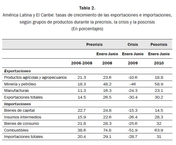 Sin embargo, es importante señalar que por ser mayor el aumento de precios de los bienes comercializables que el volumen de las exportaciones, se incrementaron las exportaciones de esos productos. ''Mientras que en 2008 los precios del petróleo y de los minerales y metales se ubicaban en un nivel 394% y 183% más elevado que en la década de los noventa, respectivamente, los alimentos solo habían aumentado un 57%'' (Machinea, 2010, p. 7). En cuanto al aumento de las exportaciones en alimentos, este tiene que ver con productos que históricamente han formado parte de este comercio, como la carne, el café, el azúcar y los plátanos, principalmente, y más recién, otros productos agrícolas como la palma africana y la soya.