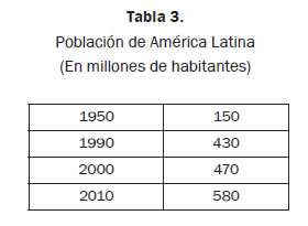 Comparemos las cifras del crecimiento demográfico de América Latina con las del mundo, en los últimos sesenta años (v. Tabla 3):