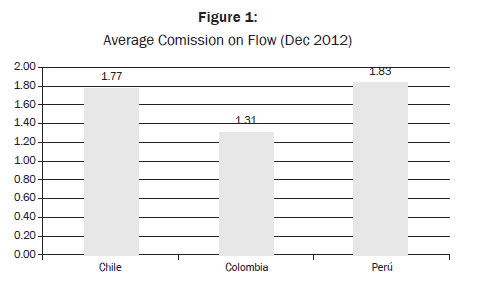 Fee on balance was applied in Chile sometime in the past and actually they use fee on flow plus a fixed fee. Colombia charges fee on flow and Mexico fee on balance plus flow. The Peruvian regulator of private pensions is attempting to reduce commissions by charging a fee on balance.5 The regulator argument is that during a given lifetime individual's contribution, the charges is lower at the beginning and higher at the end. However, for Bernal (2008) the fee on flow and fee on balance can be equivalent each other. There should be an illusion of ''dropping fees'' because at the end the individual contributor will pay the same amount over their working lifetime.6