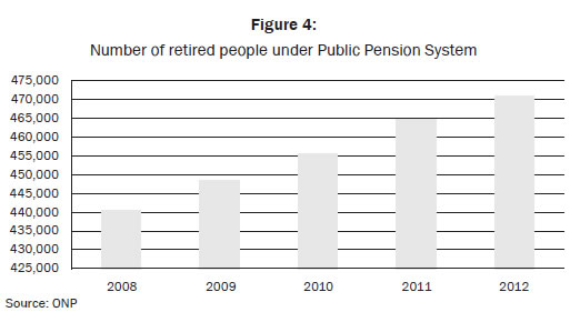 The figure below shows that the number of retired people under the ONP or Public Pension System hit almost half million people. This number should increase more, over time if we consider a scenario where the aging population increases at a rapid growth rate. Whenever the latter situation happens then the population pyramid gets broader on the peak and narrower on the base.11