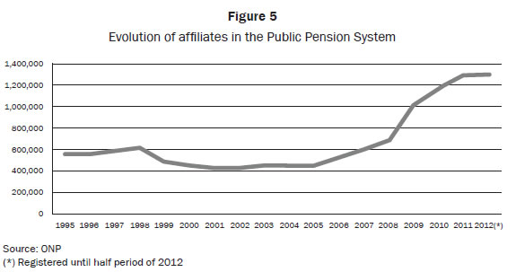 The figure below shows the possible evolution of the population pyramid where there is a significant increase in the number of affiliates to the Public Pension System. It basically has been going from 558,144 affiliates to 1'304,569 affiliates which are eventually registered in 2012. This represents an increase of 133% within 17 years. It means that in average, we may expect for every year an increase of 19% of affiliates to ONP or Public Pension System