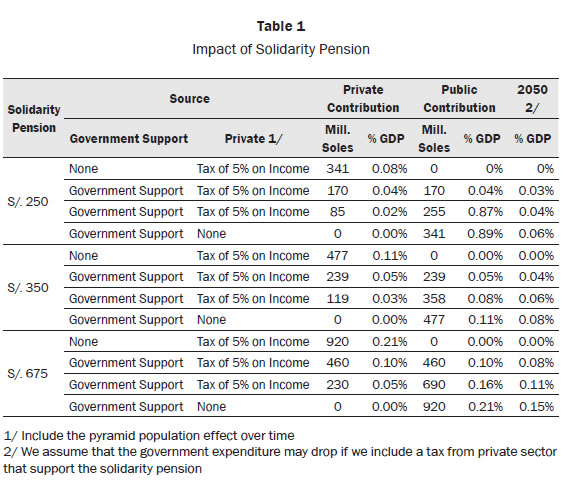 The Table below introduces some calculations that consider a scenario of Private Pension System with Pension Solidarity. The government will face payments that represent 0.15% of GDP for 2050. This is a cheaper option instead of having a Public Pension System that may trigger a fiscal vulnerability in the Peruvian economy.
