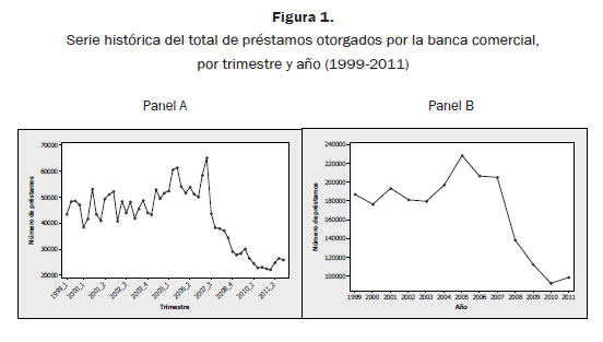 La figura 1 expone la serie trimestral del total de préstamos en el periodo comprendido del mes de enero de 1999 a diciembre de 2011. El total de préstamos para este estudio se refiere al agregado de los préstamos hipotecarios, los préstamos comerciales e industriales y los préstamos personales; de estos últimos se excluyen las líneas de crédito, tarjetas de crédito y préstamos para la adquisición de autos.