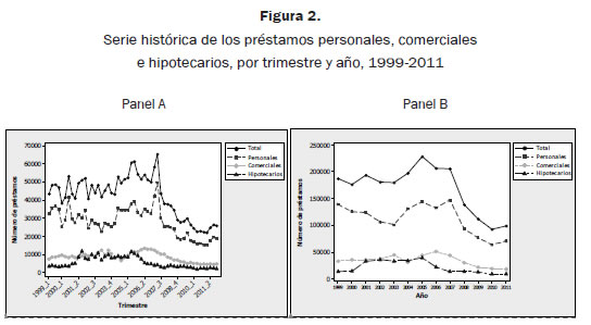 La tabla 1 y la figura 2 presentan la distribución de los préstamos otorgados por la banca, la tabla en término porcentual y anual, y la figura en términos absoluto y trimestral. Podemos notar que, en términos generales, los bancos en Puerto Rico otorgan más préstamos personales que préstamos comerciales o hipotecarios, y un número superior de préstamos comerciales e industriales, que hipotecarios. Entre 1999 y 2011, los préstamos personales fluctúan entre el 56 y el 75% del total de préstamos aprobados, siendo los años 2002 y 2003 los de porcentajes menores y 1999 el mayor, con un 74,47%. En 2011 el 71,9% del total de préstamos otorgados por la banca en Puerto Rico fueron personales. El porcentaje real debe ser mayor, ya que en este estudio no se consideran los préstamos para autos, los de líneas de crédito ni las tarjetas de crédito.