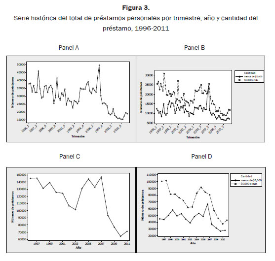 El comportamiento del número de préstamos personales aprobados por la banca comercial se presenta en la figura 3, tanto trimestral (paneles A y B) como anualmente (paneles C y D). Además, en los paneles B y D se puede comparar el comportamiento de la serie por el monto del préstamo, clasificado como menor de 5.000 dólares, o 5.000 dólares o más.