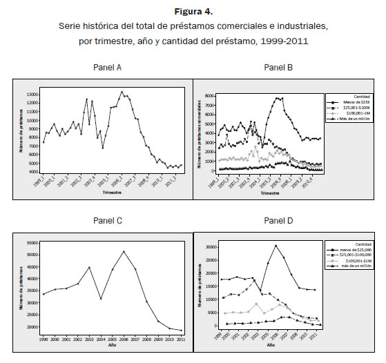 Los paneles B y D demuestran que la mayoría de los préstamos comerciales e industriales otorgados por los bancos en la isla son de menos de 25.000 dólares. Le siguen los préstamos de 25.000 a 100.000 dólares; luego, de 100.000 a 1 millón; y por último, los de más de 1 millón de dólares. La diferencia en el comportamiento de estas cuatro series se va reduciendo con el paso del tiempo. Sin embargo, desde 2005 la brecha entre los préstamos de menos de 25.000 dólares y los de cantidades mayores se amplía (aumenta drásticamente el número de préstamos otorgados de menos de 25.000 dólares, mientras que el número de préstamos de cantidades mayores se reduce); se observa claramente la tendencia de los bancos, en los últimos años, de otorgar con preferencia préstamos comerciales e industriales de menos de 25.000 dólares.