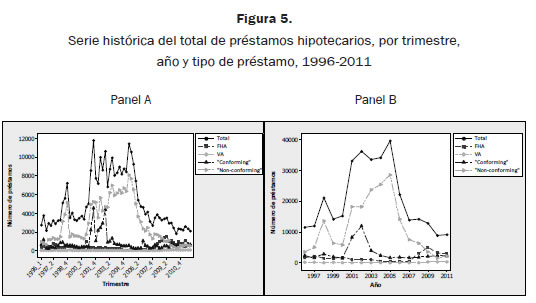 Terminamos esta sección con una mirada al caso de los préstamos hipotecarios otorgados por la banca comercial. Los dos paneles de la figura 5 nos describen el comportamiento de dichos préstamos por trimestre, año y tipo de préstamo desde 1996 hasta 2011. La figura compara cuatro tipos de préstamos hipotecarios: FHA, Veteranos (VA), convencional conforme (conforming) y convencional no conforme (non-conforming). Los préstamos FHA están asegurados y garantizados por la Federal Housing Administration y dan la opción de financiar la mayor parte de la inversión (96,5% del valor de la propiedad en caso de compraventa), minimizando los gastos de origen y descuento. Los préstamos de veteranos están garantizados por la Administración de Veteranos (VA, por sus siglas en inglés), y pueden financiar hasta el 100% del precio de venta de la propiedad. Por otra parte, los préstamos convencionales no están asegurados ni garantizados por una agencia federal, y se pueden clasificar en dos tipos: los préstamos conforming, que son elegibles para ser vendidos a los inversionistas Freddie Mac y Fannie Mae cuando tanto el deudor como la propiedad cumplen con ciertos criterios específicos, con un tope de 417.000 dólares, y los non-conforming, que para su aprobación no es necesario cumplir con los criterios establecidos por Freddie Mac y Fannie Mae, se prestan desde 417.001 hasta 1 millón de dólares y es una de las alternativas para préstamos de alto riesgo.