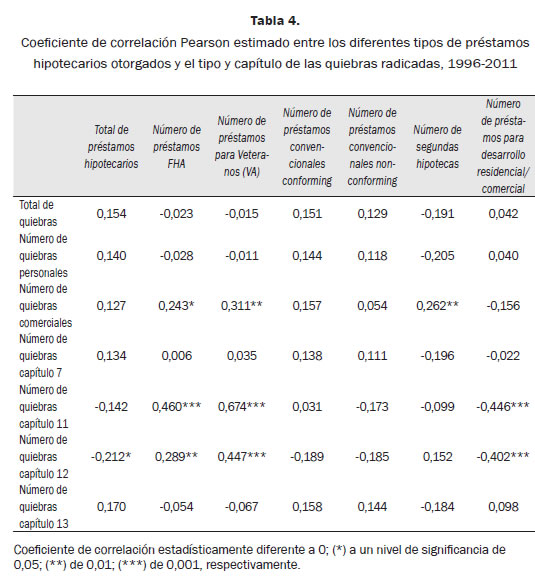 La tabla 4 detalla las correlaciones estimadas entre los diferentes tipos de préstamos hipotecarios otorgados por los bancos y el tipo de quiebras (comercial o personal), y el capítulo utilizado al radicar. Se destaca la fuerte correlación positiva entre el número de quiebras radicadas bajo el capítulo 11 (reorganización) y el número de préstamos de veteranos otorgados por bancos (r = 0,674); los préstamos de veteranos también están asociados positivamente al número de quiebras bajo el capítulo 12 (ajuste de deudas para agricultores y pescadores). Otra de las correlaciones significativas es la que se encontró entre el número de quiebras radicadas bajo el capítulo 11 y el total de préstamos hipotecarios FHA aprobados por la banca.