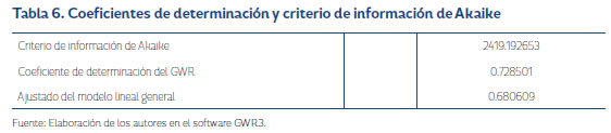 Como se muestra en la Tabla 6, el modelo GWR presentó un coeficiente de determinación más alto que el producido por el modelo lineal general (68,74%), explicando el 72,85% de la variación en los cánones de arrendamiento de las viviendas: