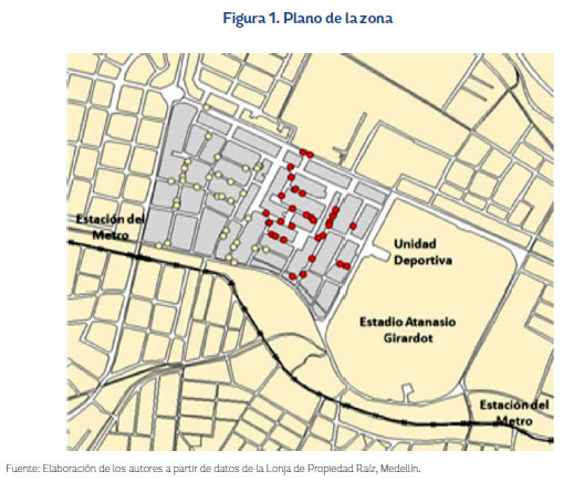 En la Figura 1 se observa el plano de la zona, donde cada punto representa un dato de oferta de arrendamiento. También se aprecia la localización de dos estaciones del metro, el viaducto del metro, la unidad deportiva y el estadio Atanasio Girardot.