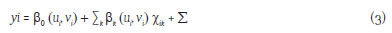 donde (ui, vi) representan las coordenadas que describen la ubicación geográfica de la observación .