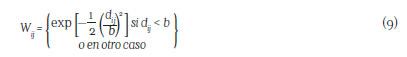 donde W (ui, vi) es la matriz de pesos espaciales de dimensión (nxn) de la observación correspondiente a las coordenadas (ui, vi). Las componentes Wi,j de dicha matriz son calculadas a partir de una función kernel, usualmente la función gaussiana, la cual asigna una mayor ponderación a las obser vaciones más cercanas y una de cero si la distancia entre las dos observaciones supera la distancia b, conocida como el ancho de banda.