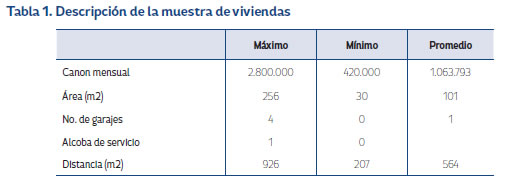 Las estadísticas descriptivas de la Tabla 1 muestran la diversidad de las viviendas en arrenda- miento de la zona, que incluyen desde apartaestudios de 30 m2 hasta casas de 256 m2, con cánones que oscilan entre $420.000 y $2.800.000 por mes: