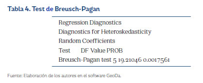 Una vez detectada la posible presencia de heterogeneidad espacial, se aplicó el test de Breusch-Pagan, el cual permite comprobar si es posible encontrar un conjunto de variables que sirvan para explicar la evolución de la varianza de las perturbaciones aleatorias del modelo lineal general estimado por mínimos cuadrados ordinarios (De Arce & Mahía, 2008).