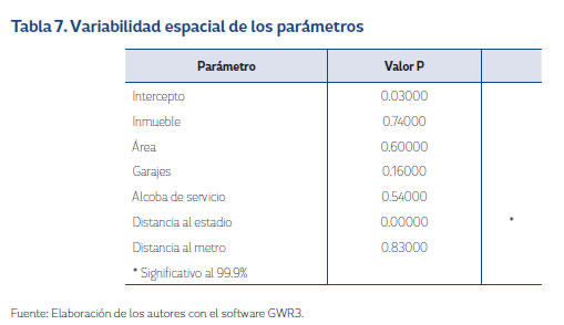 Como se muestra en la Tabla 6, el modelo GWR presentó un coeficiente de determinación más alto que el producido por el modelo lineal general (68,74%), explicando el 72,85% de la variación en los cánones de arrendamiento de las viviendas: