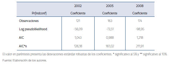 Para el ejercicio se decide realizar estimaciones empleando modelos probit de corte transversal y estimando los errores estándar de los coeficientes de forma robusta a fin de obtener parámetros consistentes ante la presencia de heterocedasticidad en la muestra. Se decide presentar la información de las tres estimaciones correspondientes a los años 2002, 2005 y 2008 con la respectiva combinación, con base en los siguientes criterios de bondad de ajuste: el Log Pseudolikelihood, el cual expresa el valor de la función de verosimilitud; el criterio de información AIC (Akaike). Por último, cabe resaltar que los resultados que se muestran a continuación presentan problemas de sesgo de selección, dado que los municipios que no cuentan con información para alguna de las variables serán retirados de la muestra. En la Tabla 2 se muestran los resultados del modelo estimado.