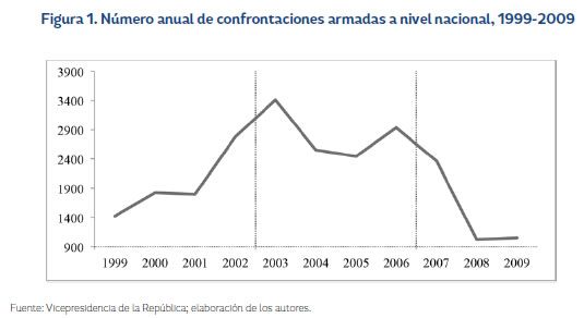Durante este periodo se dio inicio a una avanzada militar que terminó con el abatimiento de reconocidos jefes de las FARC, obligando a los guerrilleros a replegarse y evitar la baja de más miembros de alto valor en sus filas (Echandía, 2011). No obstante, a partir de 2009 las FARC iniciaron una campaña titulada ''renacer'', concentrada especialmente en el sur colombiano, que les permitió mantener o retomar zonas estratégicas en la región Orinoquia. En este periodo la cantidad de confrontaciones armadas presentó una reducción, hasta permanecer constantes a partir de 2008 (Figura 1).