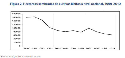 Los grupos insurgentes desplegaron acciones armadas que terminaron con tendencia creciente en su actividad, contrario a lo presentado por la Fuerza Pública, la cual disminuyó de manera considerable en el número de operativos (Figura 4). El número de hectáreas sembradas de cultivos ilícitos presentó una disminución desde el 2007 hasta el 2010 (Figura 2).