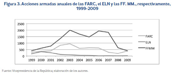 Las acciones armadas de las fuerzas militares no variaron significativamente durante este periodo, tanto las FARC como el ELN presentaron una importante disminución de sus acciones militares, como se muestra en la Figura 3.
