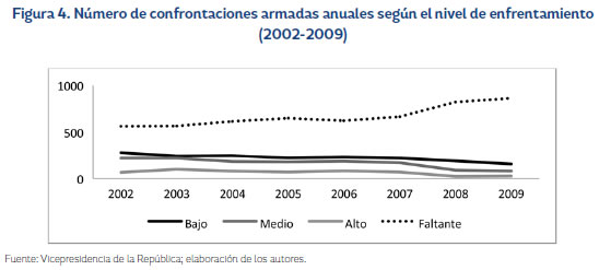 3 Se entender á por intensidad del conflicto las acciones desplegadas, ya sea por las Fuerzas Armadas o por los grupos insurgentes, que llevan a enfrentamientos directos en búsqueda del control territorial. Para su medición se tomarán las confrontaciones armadas por año.