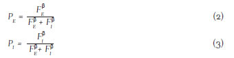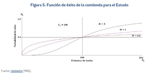 donde PE + PI = 1, lo que permite que PE crezca ante aumentos en FE y reduzca con incrementos en FI. Las ecuaciones (2) y (3), FEC, resumen la tecnología del conflicto y serán los esfuerzos de combate los que determinen las probabilidades de éxito, que serán mejores entre más cercanos estén a 1. Asimismo, el parámetro b es un coeficiente decisivo,12 pues representa el grado en que un mayor esfuerzo en combates se traduce en un éxito en batalla, y para este modelo siempre será mayor que cero; adicionalmente a dicho parámetro se le incorporó un valor asociado a los intereses políticos traducidos en los réditos electorales que otorga la existencia o no del conflicto. Cuando este es bajo, es más probable que los jugadores elijan la paz o estén dispuestos a reducir la intensidad del conflicto; por el contrario, un valor alto de b indica que las partes están interesadas en aumentar los niveles de conflicto.