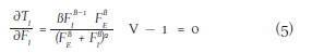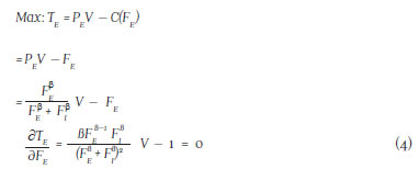 Así, cada jugador i maximiza la ecuación (1) dada las FEC, en las ecuaciones (2) y (3). Esta interacción se asemeja a la de Cournot, en la cual jugadores simétricos eligen independientemente y sin posibilidades de colusión. Aplicando el equilibrio de Nash, la función de reacción está dada por:
