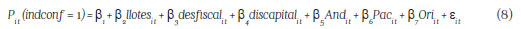 Por las restricciones descritas se decidió realizar estimaciones de modelo probit con datos de corte transversal, presentando tres estimaciones, correspondientes a los años 2002, 2005 y 2008, que representan al periodo previo y al primero y segundo periodo de la SD, respectivamente. Estos tres años se eligieron dado que presentaban la mayor cantidad de datos posibles; por lo que la selección de los años en mención y de una variable por categoría fue la combinación más robusta (teniendo en cuenta la significancia, número de datos y criterios de bondad de ajuste que se presentarán más adelante). A continuación se presentan las variables seleccionadas: lotes (logaritmo natural del número de lotes con sembrados de coca) como la variable asociada a la viabilidad financiera del conflicto, de ella se espera que su relación sea positiva debido a que ante la presencia de lotes se espera que los insurgentes estén asentados y decidan proteger esos territorios; desfiscal (desempeño fiscal) como proxy de la presencia y poder institucional, se espera una relación negativa dado que ante un mejor desempeño institucional se espera que el municipio presente menos problemas de orden público; para ldiscapital (logaritmo natural a la distancia del municipio a la capital de su departamento) se realiza un análisis exploratorio de la relación de esta variable sobre la incidencia del conflicto, por lo que puede tomar valores positivos o negativos; finalmente, se introducen variables dicotómicas que identifican la pertenencia de un municipio a una región para tratar de identificar localización y procesos de relocalización del conflicto; asumen el valor de 1 en caso de pertenecer a una de las regiones, y 0 en caso contrario, las regiones consideradas son: Andina (And), Caribe (Car), Pacífica (Pac) y Oriental (Ori); esta última comprende las regiones naturales de Amazonia y Orinoquia. De lo anterior se presenta la ecuación a estimar: