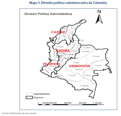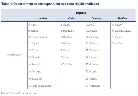 Para una mejor comprensión de las dinámicas del conflicto armado en Colombia se citan los departamentos correspondientes a las regiones de estudio (Tabla 1) y el respectivo mapa político de Colombia (Mapa 1). Además, en el Mapa 1 se realiza una división de Colombia en cuatro regiones para facilitar el análisis geográfico de la intensidad y localización del conflicto armado.