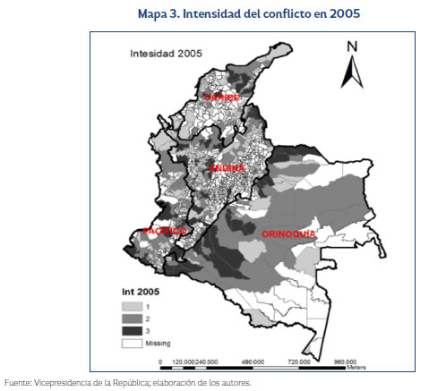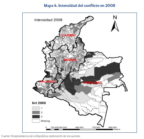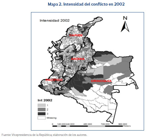 Dado que uno de los principales objetivos del presente trabajo es capturar la dinámica de la intensidad del conflicto armado, se realiza un mapeo de la intensidad del conflicto en 2002, 2005 y 2008.