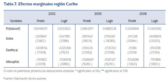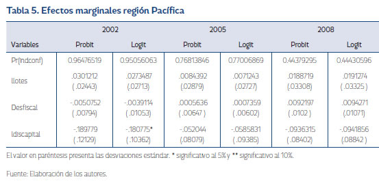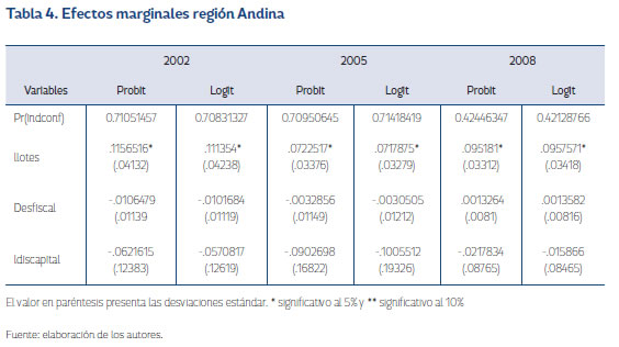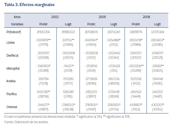 En las estimaciones, la variable llotes, que trata de explicar la viabilidad del conflicto, se encuentra que esta es significativa para los tres años y su aporte en probabilidad en la incidencia del conflicto por un lote adicional de cultivos de coca es de 0,031 en 2002; 0,041 en 2005; 0,07 en 2008. Se observa tendencia de aumento en la incidencia del conflicto tanto para el modelo probit como para el modelo logit, evidenciando la importancia de los cultivos de coca en el conflicto. En el caso de desfiscal, que se introduce como proxy de la presencia y poder de las instituciones, no se halla evidencia de una relación existente entre esta y la probabilidad de presentar conflicto. Para ldiscapital se encuentra que es significativa en los años 2002 y 2008, presentando una relación negativa del 0,156 y 0,09 respectivamente.