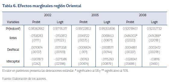 De las estimaciones se aprecia que el signo de llotes es positivo y significativo en los tres años. Para desfiscal se encuentra que no es significativa y solo el año 2005 presenta el signo esperado. En ldiscapital se halla una relación negativa y significativa en los años 2002 y 2008, indicando que a mayor distancia del municipio respecto a la capital del departamento la probabilidad de presentar conflicto se reduce. Respecto de las variables dicotómicas regionales introducidas para identificar la importancia de una región en la localización del conflicto, se nota que la región Oriental presenta una relación positiva y significativa en los tres años.
