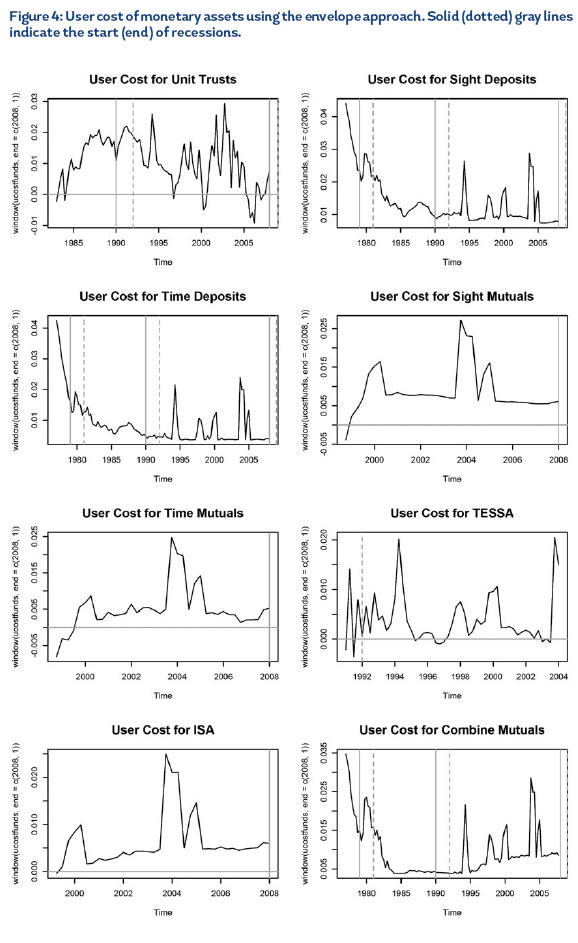To compute the user cost of monetary assets, we need data on monetary aggregate components for the U.K. We consider the following components used in the computation of the Monetary Services Divisia Index: Interest-bearing banks sight deposits (1977Q1-2011Q1), interest-bearing bank time deposits (1977Q1-2011Q1), interest-bearing sight deposits at mutuals (1998Q4-2011Q1), interest-bearing sight deposits at mutuals (1998Q4-2011Q1), and cash individual saving accounts (ISA). (1999Q2-2011Q1). Definitions and data for each component are available at the Bank of England5.