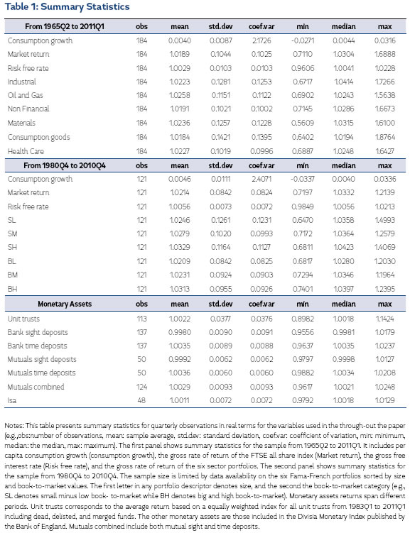 Table 1 presents summary statistics for the variables we use in the estimation (e.g., obs:number of observations, mean: sample average, std.dev: standard deviation, coef.var: coefficient of variation, min: minimum, median: the median, max: maximum). All values are in real terms and are computed from quarterly observations. The first panel shows summary statistics for the sample from 1965Q2 to 2011Q1. In this sample, we include per capita consumption growth (consumption growth), the gross rate of return of the FTSE all share index (Market return), the gross free interest rate (Risk free rate), and the gross rate of return of the six sector portfolios. The second panel shows summary statistics for the sample from 1980Q4 to 2010Q4. The sample size is limited by data availability on the six Fama-French portfolios sorted by size and book-to-market values. The first letter in any portfolio descriptor denotes size, and the second the book-to-market category. For instance, SL denotes small minus low book-to-market while BH denotes big and high book-to-market.