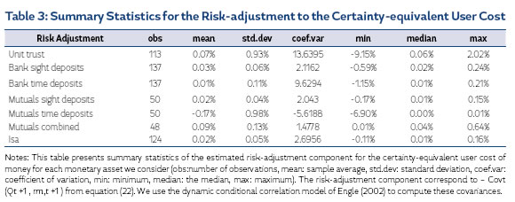 The first term in (22), (r f ,t − Et [rm,t +1])/r f ,t , corresponds to the certainty-equivalent user cost of each monetary asset m. The second term, – Covt (Qt +1, rm,t +1), is the risk- adjustment to the certainty- equivalent user cost. When the risk-adjustment is large, Divisia Monetary Indexes using the certainty-equivalent user cost will be biased. Table 3 presents summary statistics of the risk-adjustment estimates for each monetary asset over their respective sample period and Figure 1 depicts their behavior over time.