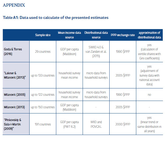 15 Studies have to choose between (different) PPP exchange rates and market exchange rates, household or national account means, expenditure or (gross or net) income, and grouped or individual-level data. Moreover, many studies estimate within-country distributions and and extrapolate some data — see Anand and Segal (2008), Goda (2013), and Lakner and Milanovic (2013) for an in-depth discussion.
