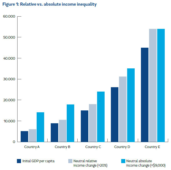 Relative income inequality refers to the average disproportionality of income, whereas absolute inequality conceptualises income differences in money terms. To make the difference between these two inequality measures more palpable, Figure 1 demonstrates an income neutral change in relative and in absolute terms. Initially, Country A has an income of $5,000 while the income of Country E is $45,000 (light grey bars). If the income of all countries increases by 20% (black bars), Country E still has 9 times the income of Country A but the absolute income difference between the two countries increases to $48,000. If the income of all countries increases by $9,000 (dark grey bars), the absolute income difference between these two countries remains $40,000, but now Country E 'only' has approximately four times Country A's income.3 This simple comparison shows that absolute and relative inequality trends can differ significantly.