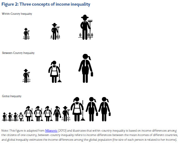 Between-country inequality, on the other hand, concerns differences in the average income of countries (typically measured by GDP per capita data adjusted for purchasing power parity (PPP)). Finally, population size-adjusted inequalities between and within countries are used to estimate the degree of inequality between global citizens.5 To be more precise, the concept of global inequality compares the incomes of poor people in rich countries with that of rich people in poor countries, the incomes of rich people in poor countries with that of poor people in rich countries, etc. (See Figure 2 for an illustration of these three concepts).